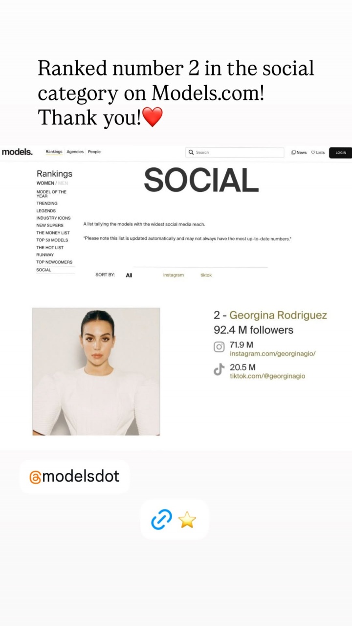 01月 25 2026 0 好博体育官网-顶流!乔治娜晒社媒总粉丝量,ins近7200万+tiktok突破2000万 xiaoqiao 2026-01-25 德甲 1 1月15日讯 乔治娜昨日更新社媒,她晒出了自己的粉丝数据排名,她在models.com网站上social分类排名第二。乔治娜社媒总粉丝量为9240万,其中,instagram的粉丝量为7190万,tiktok的粉丝量达到2050万。